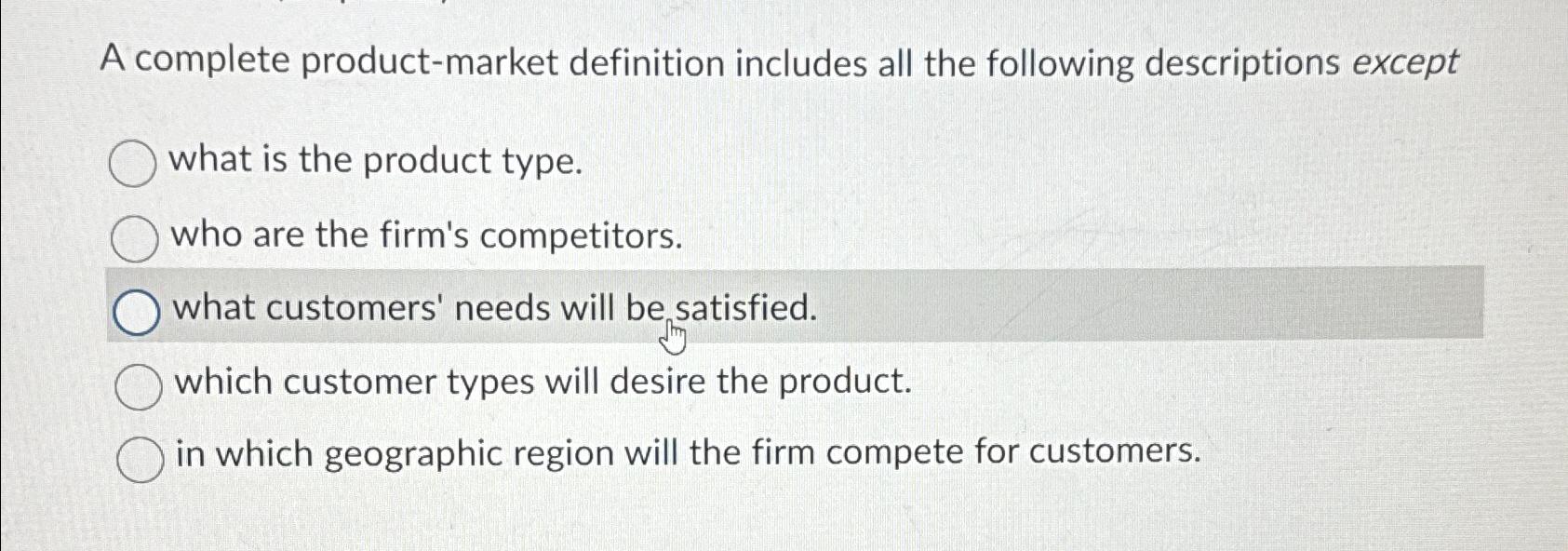 Quiz 4 ProductMarket Fit ( Questions with complete solution) Browsegrades Product Market Definition Quizlet what is a product market? As part of a firm’s marketing strategy development, they are likely to define the markets and/or sub. term product market definition: In product management, the product market refers to the specific target customers a. Households buy goods and services, supply firms with labor to produce goods and services. A market used to exchange. Product Market Definition Quizlet.